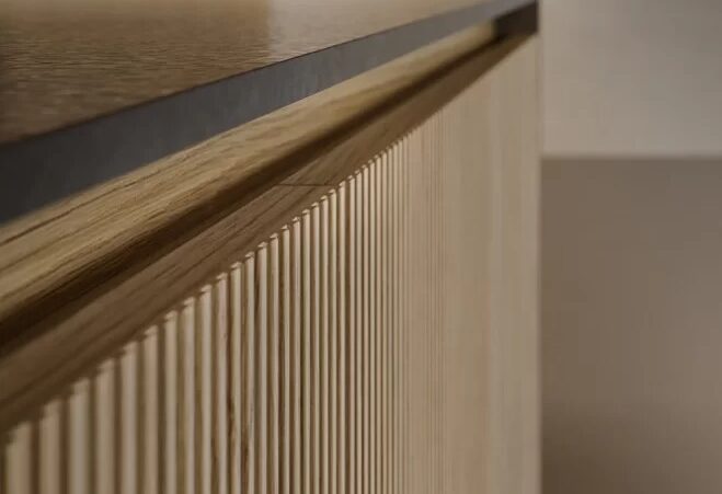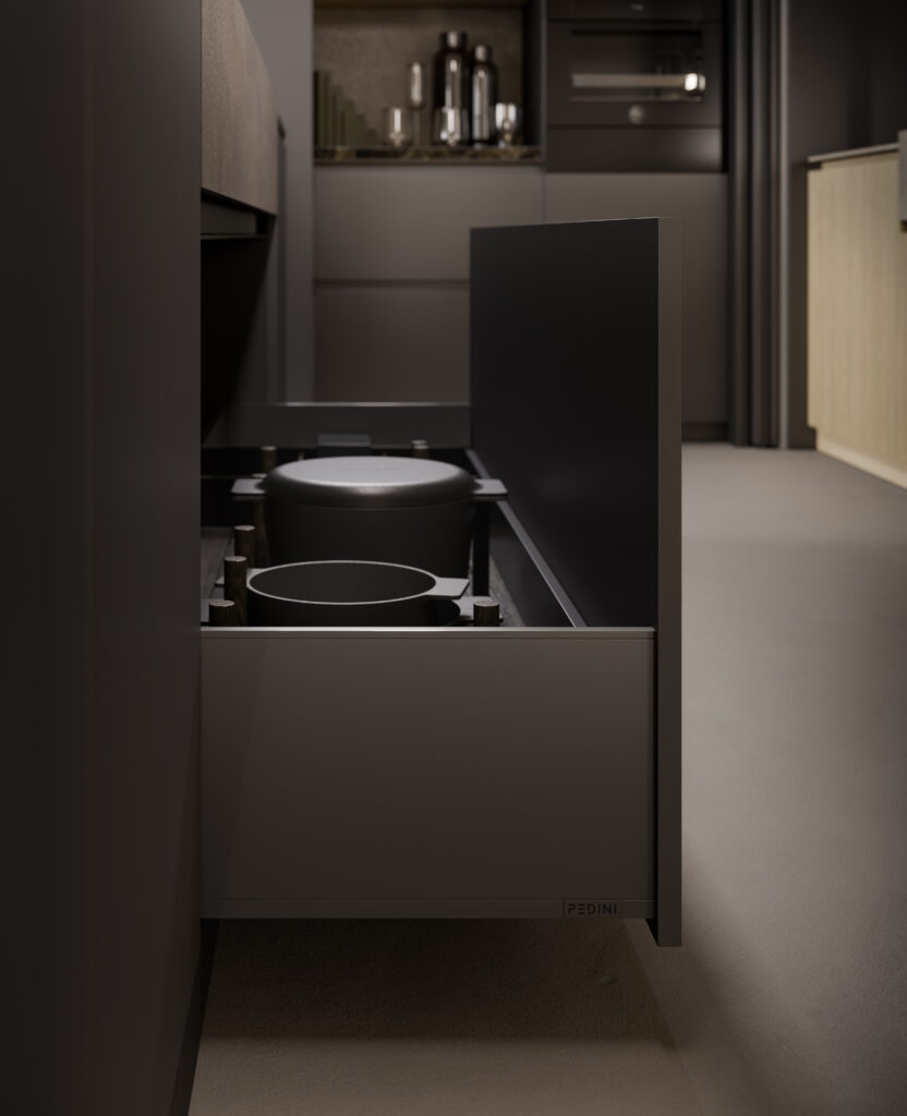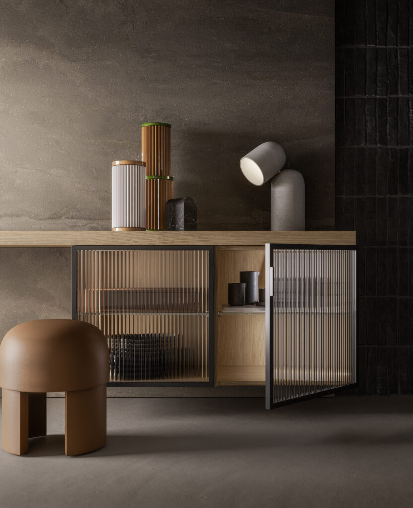 The Bridge accessories and containers, strategically positioned above the worktop and adjacent breakfast table in Terra Oak, serve as both functional elements and aesthetic accents within the Arkè Kitchen. Their thoughtful placement not only enhances usability but also creates a pleasing visual contrast against the kitchen’s backdrop. As accessories manufactured 100% in Italy with versatility in mind, these modules offer customised features and are available in a wide range of finishes, allowing them to integrate seamlessly with the evolving design scheme of the surrounding space. As such, they not only add practicality to daily kitchen routines but also contribute to the overall character and sophistication of the environment, ensuring a harmonious balance between form and function.