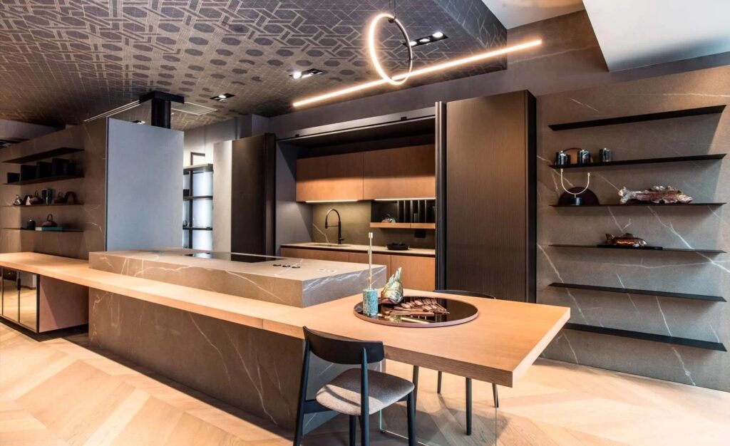 The functionality of the Italian-designed Arkè Kitchen shines through with its cleverly equipped niches and tall units adorned with LED lights, creating a sense of fluidity and ease of movement. Its innovative mechanisms allow for effortless door opening, whether with or without the use of handles, adding a touch of convenience and Made-in-Italy quality to the space.