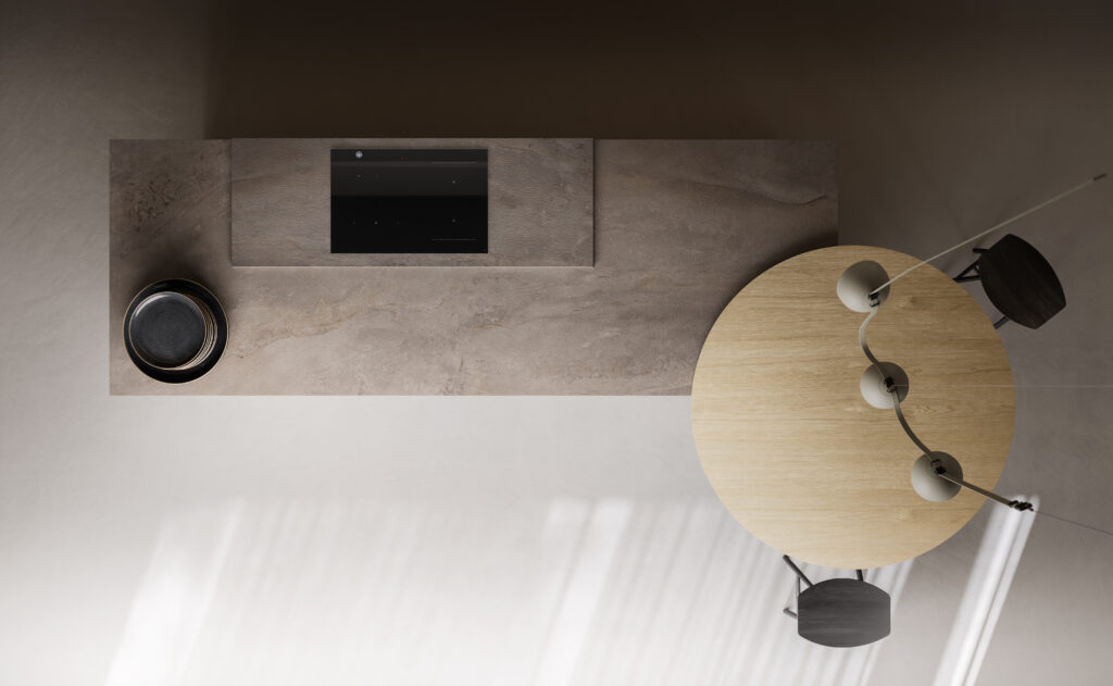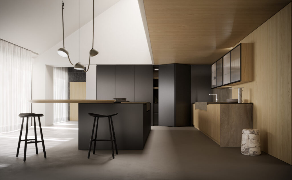 The Arkè kitchen exudes modern elegance through its superior Italian choice of materials, with base units and tall units finished in matte lacquer Magma complemented by a matte gres worktop in Fokos Roccia. These refined combinations, perfected through Italian craftsmanship, lend character to the space, accentuating its geometric volumes and emphasising the sleek lines that define the environment.