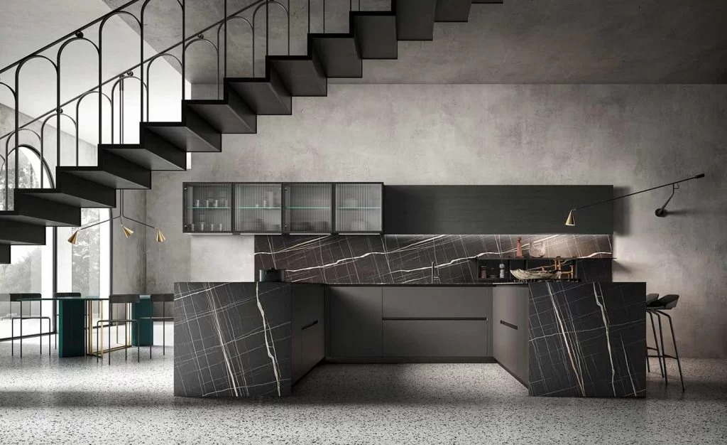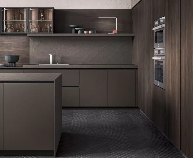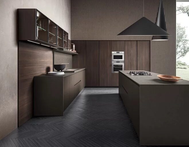 Aroma Kitchen’s distinctive appeal lies in its customisable materials and colour combinations, offering a myriad of options to suit individual preferences. Featuring Sahara laminate, dark grey thermo-structured surfaces, float glass, Black Oak, and matte black lacquer, these elements, sourced and perfected with Italian design expertise, converge to create a sophisticated and elegant ambience throughout the kitchen space.