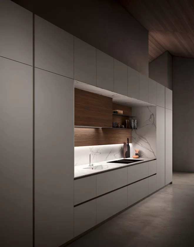 In the Aroma Kitchen, the wall units stand out as versatile components, offered in a variety of colours to suit different tastes and preferences. These suspended units feature water-repellent doors and PVC-finished edges, ensuring the durability and resilience expected of Italian manufacturing. Whether opting for a groove or integrated handle design, both options contribute to a seamless and cohesive aesthetic throughout the space.