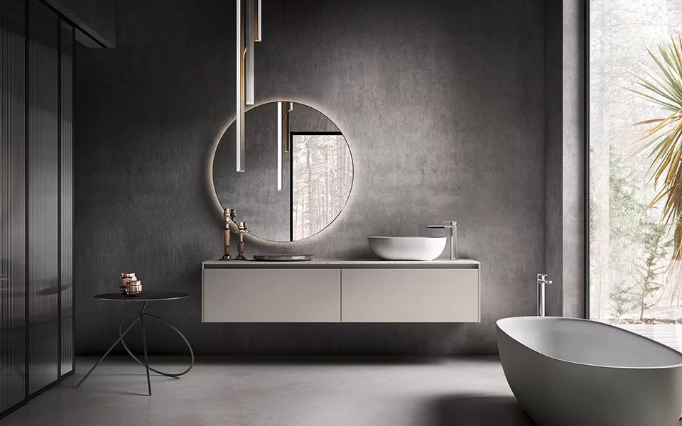 Natural light gracefully illuminates every aspect of the space, accentuating the clean lines and harmonious material combinations. The elegance of veined gres, the warmth of chromatic thermo-structured surfaces, and the ethereal quality of float glass—all Italian-sourced materials—beautifully complement each other, enhancing the visual appeal of the suspended wall units.